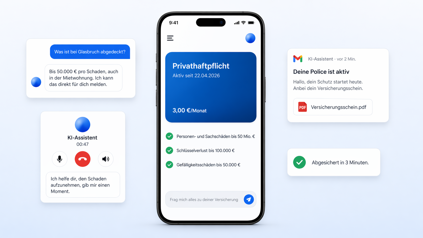 Dein persönlicher KI-Assistent für alles rund um deine Versicherung — Tarifauswahl, Abschluss, Vertragsverwaltung und Schadenmeldung. Per Chat, E-Mail oder Telefon, rund um die Uhr.
